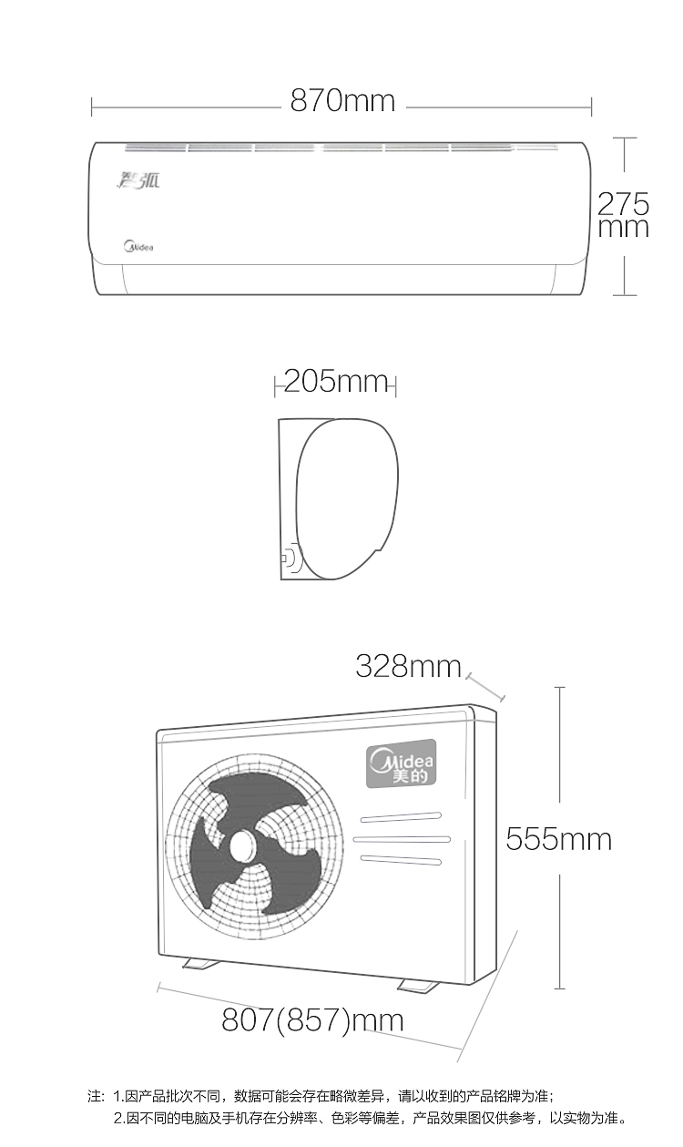 870*275*205外机机身尺寸(宽x高x深)mm: