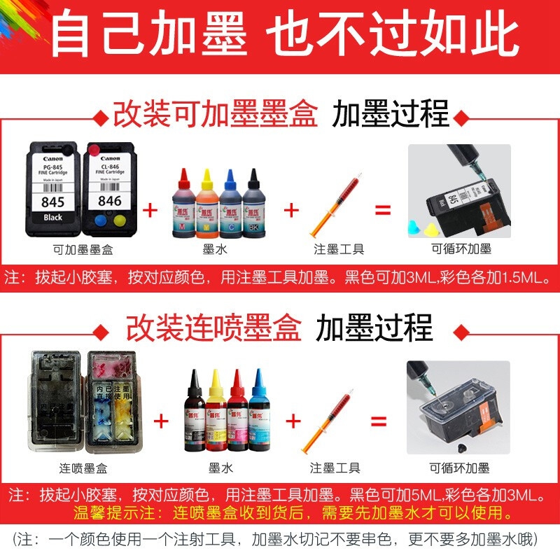 佳能PG-845/CL-846墨盒TS3180/MG2580S/TS3083080打印机一体机 845黑色改装可加墨墨盒