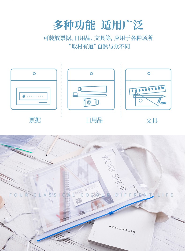 A456透明pvc防水软质拉链拉边文件袋档案收纳发票据考试笔袋 得力5526 A4拉边袋12只(四色)