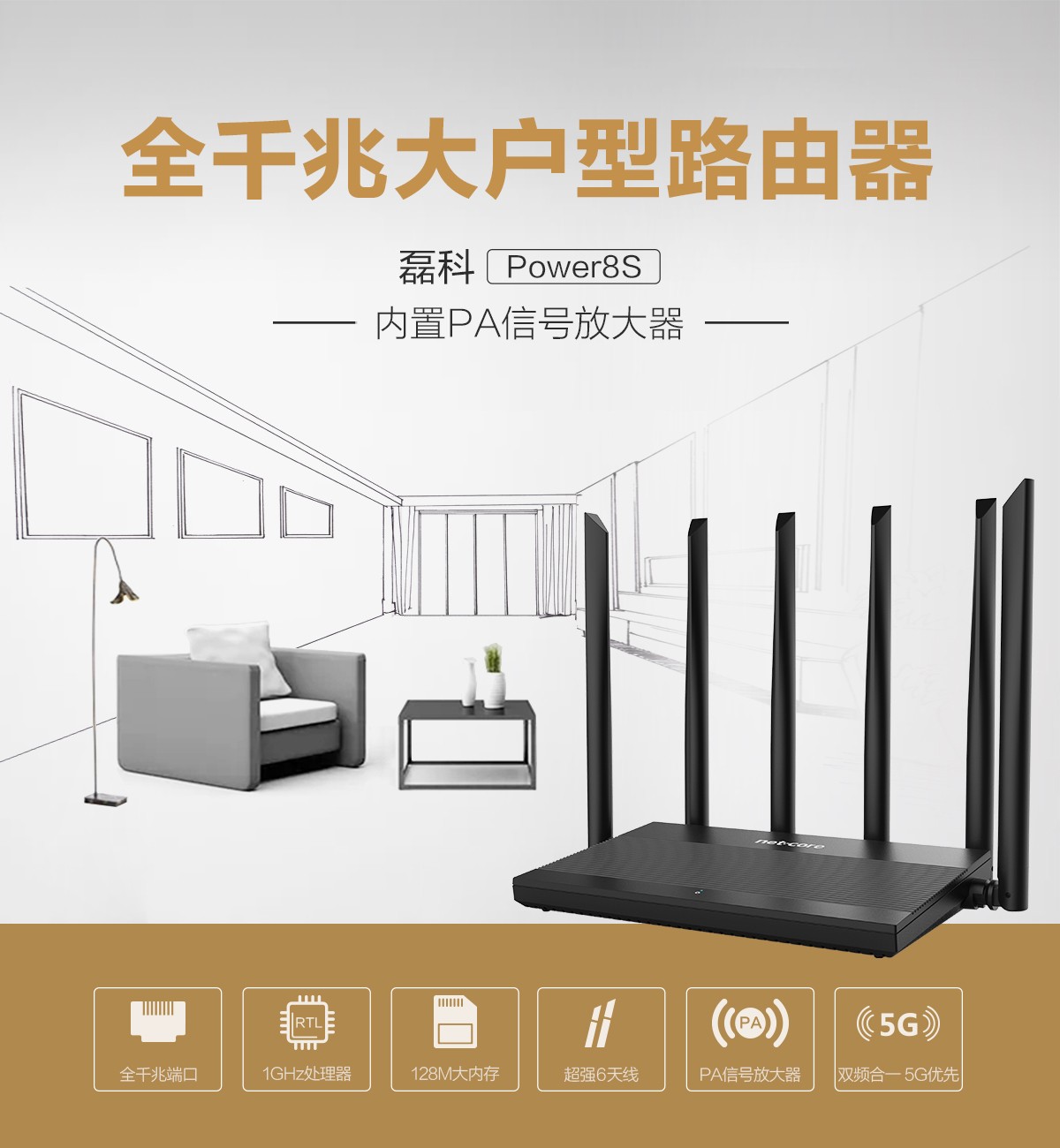 磊科(netcore)新品Power8S,6根7dBi高增益全向天线,智能管理路由器